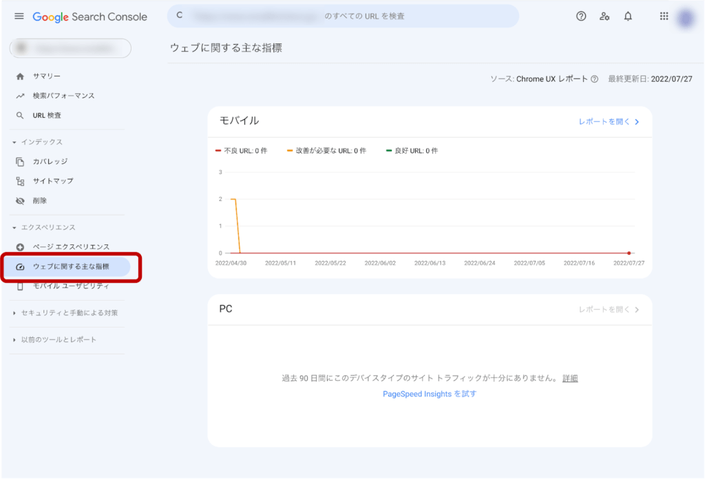 サイトのユーザービリティ(動作)をチェックするためには「ウェブに関する主な指標」と「モバイルユーザビリティ」という2つの項目を確認します。