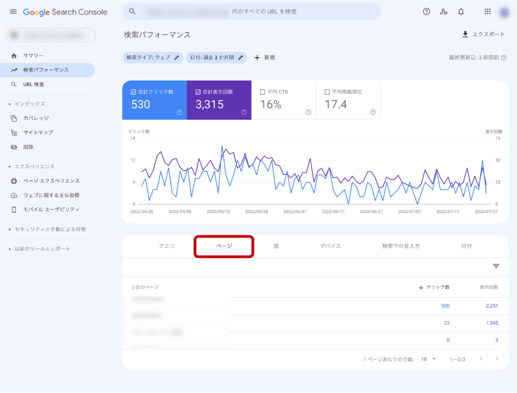 例えば、「ページ」タブを選択すると、特定のURLの「検索でのクリック数」「検索での表示回数」「CTR(検索でのクリック率)」「検索での掲載順位」を確認することができます。
