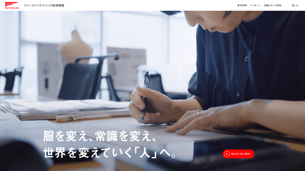 まず初めに紹介するのは、株式会社ファーストリテイリングの「服を変え、常識を変え、世界を変えていく「人」へ」というコピーです。ファーストビューで閲覧者に変革を感じさせるフレーズとなっています。